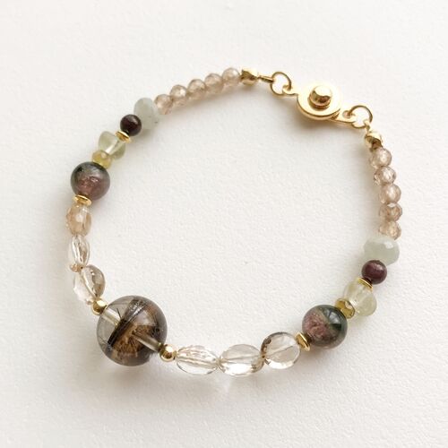 願いを叶えるアクセサリー続々作っております。こちらは従兄弟からオーダー頂いたブレス。男性用です。当初、黒い色の石で組んでとのことだったので、魔・ミアズマ(瘴気)祓いのテーマで石を選びましたが、従兄弟から恋愛系の願いを頂きまして、この見た目…
