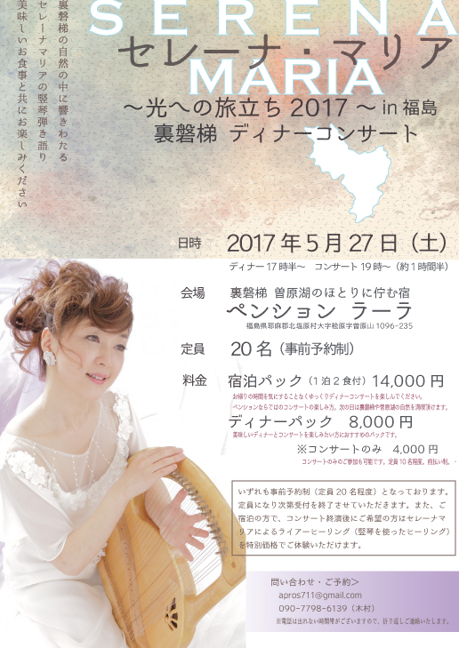 「セレーナマリアコンサート〜光への旅立ち2017〜in福島」日時 : 5月27日(土)会場 : 裏磐梯高原 ペンションラーラディナースタート 17時半~コンサートスタート 19時~(約90分)価格◇①宿泊(ディナー&朝食付)+コンサート 14,000円(税込)②ディナー+コンサート 8,000円(税込)③コンサートのみ 4,000円(税込)※事前予約制・詳細はフライヤーをご覧ください。いずれも定員になり次第締め切らせていただきます。ご予約・お問い合わせ apros711@gmail.com090-7798-6139(木村)